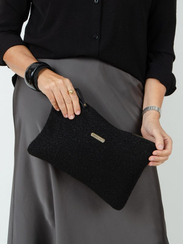Clutch ideal para organizar tu bolso o para llevarlo de bolsito de mano, confeccionado con tejido de tapicería efecto lana en color taupe.