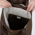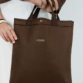 Lleva doble asa de suave cinta de algodón reciclado 100% en color marrón.