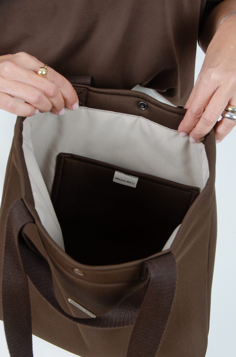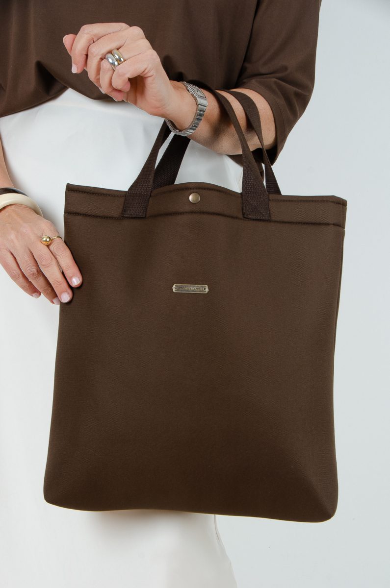 Bolsa tipo tote bag de gran capacidad y comodidad, confeccionada en tejido de tapicería tipo neopreno de color marrón chocolate.