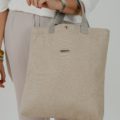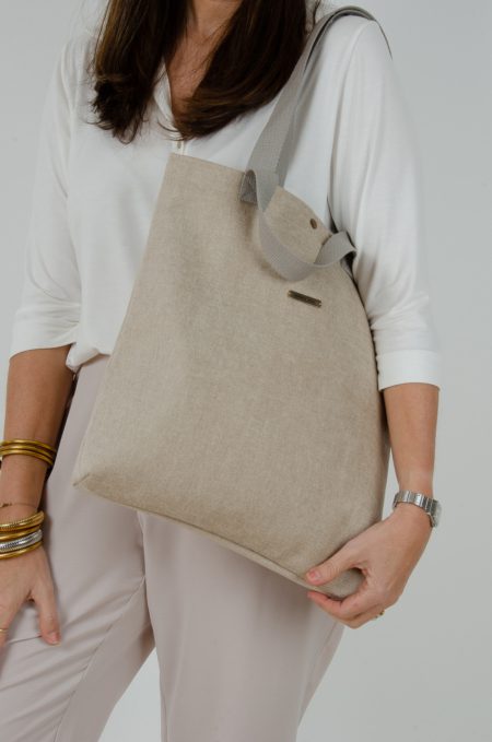 Bolsa tipo tote bag de gran capacidad y comodidad, confeccionada en tejido de tapicería de color piedra.
