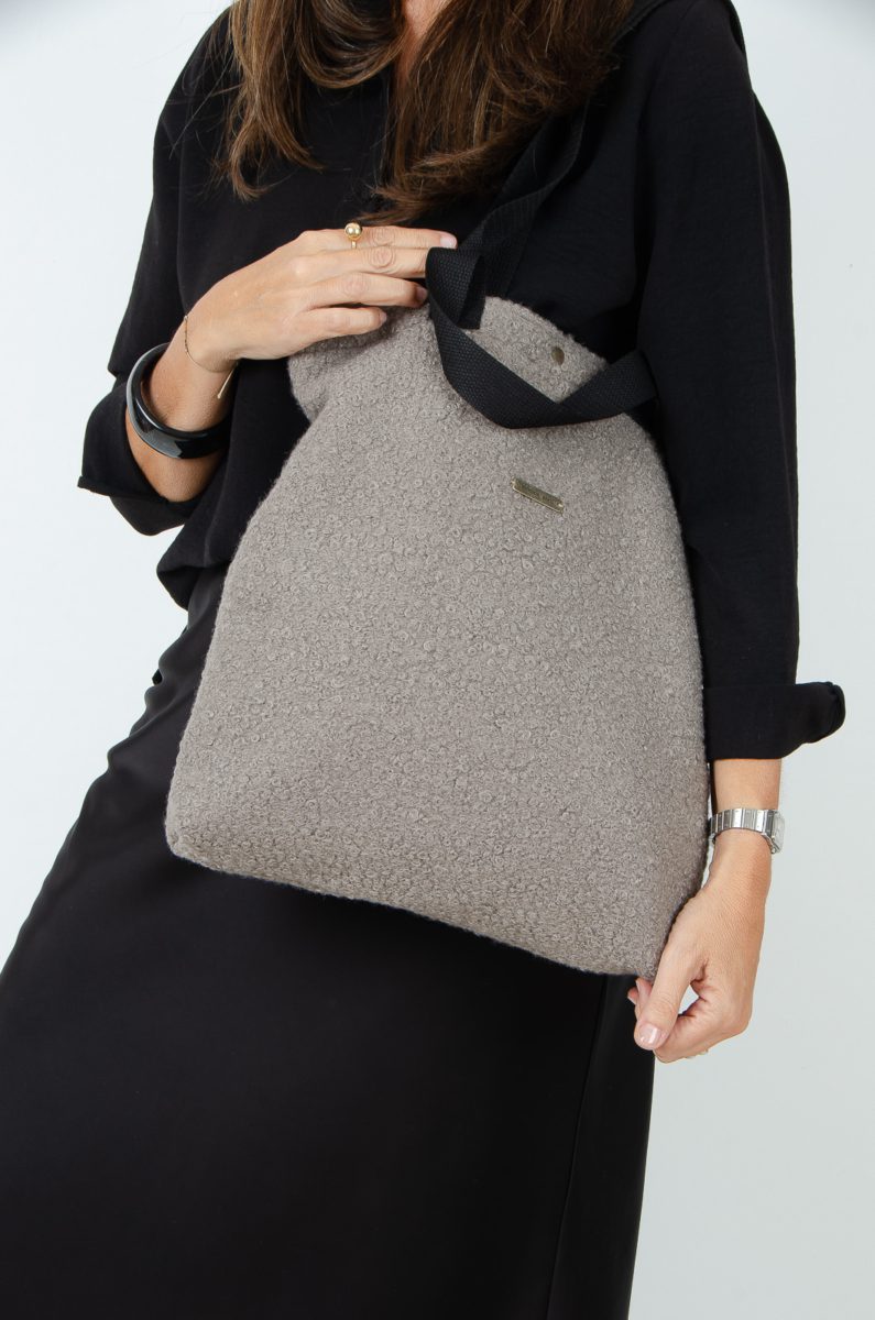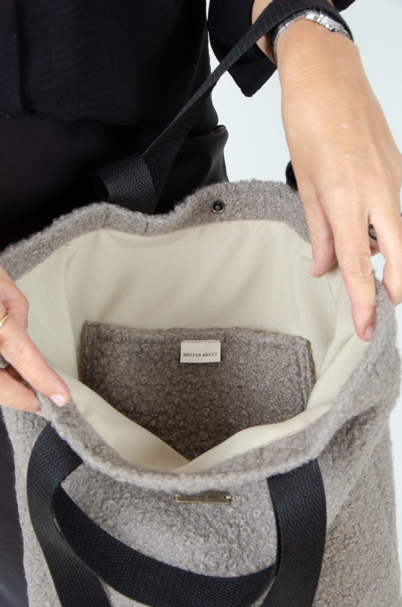 Bolsa tipo tote bag de gran capacidad y comodidad, confeccionada en tejido de tapicería efecto lana en color taupe.