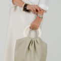 Bolso confeccionado con tejido de tapicería efecto piel en color arena, ligero y resistente decorado con elegantes anillas de resina en color crudo de 13cm de diámetro.