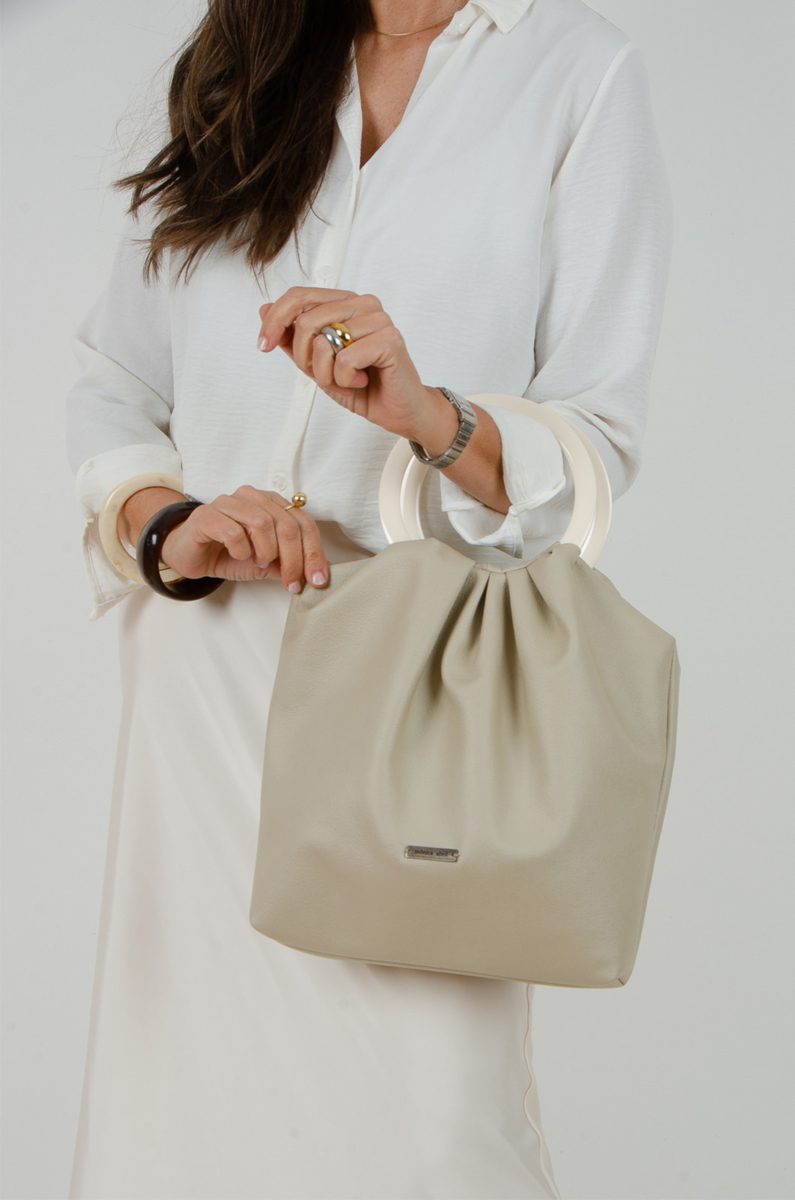 Bolso confeccionado con tejido de tapicería efecto piel en color arena, ligero y resistente decorado con elegantes anillas de resina en color crudo de 13cm de diámetro.