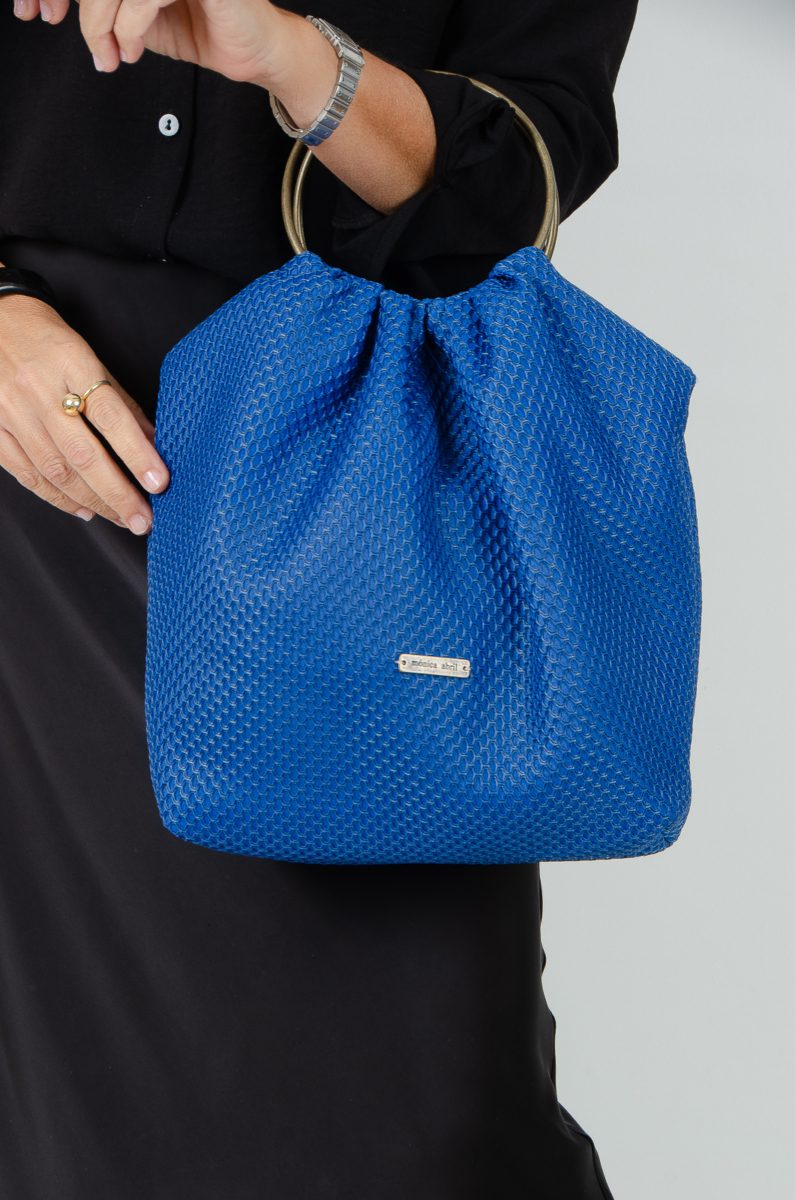 Bolso confeccionado con tejido de tapicería tipo neopreno en color azul klein, ligero y resistente decorado con elegantes anillas en color oro viejo de 13 cm de diámetro.