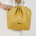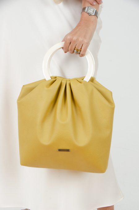 Bolso confeccionado con tejido de tapicería efecto piel en color lima, ligero y resistente decorado con elegantes anillas de resina en color crudo de 13cm de diámetro.