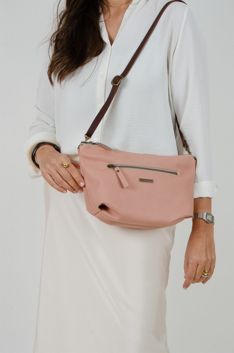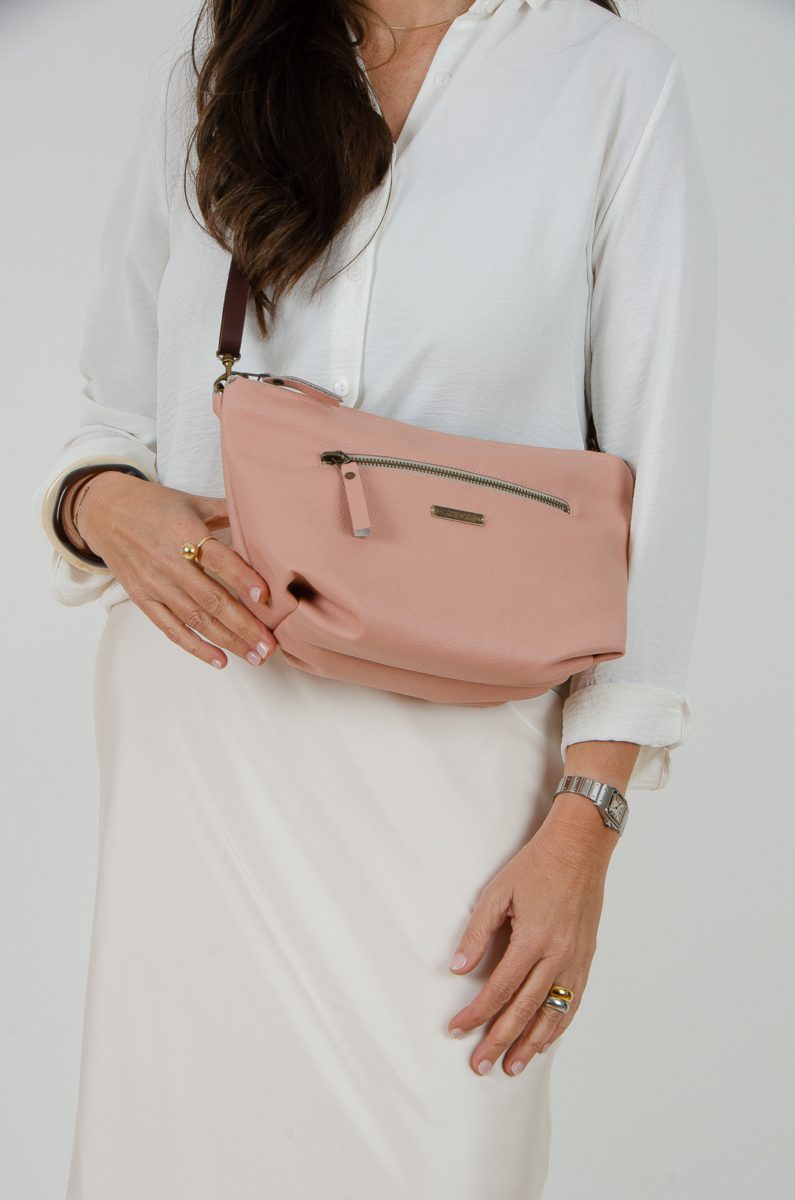 Bolso confeccionado en tejido de tapicería efecto piel en color rosa, con práctico bolsillo exterior cerrado con cremallera.