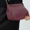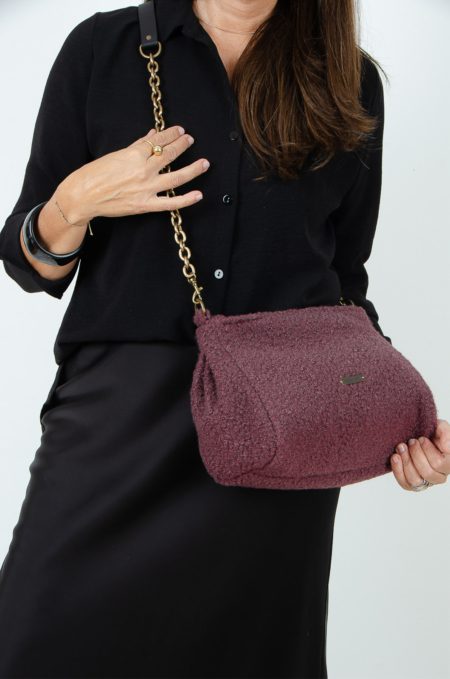 Bonito bolso confeccionado en tejido de tapicería efecto lana en color burdeos, lleva cierre de cremallera con tirador de piel negro.