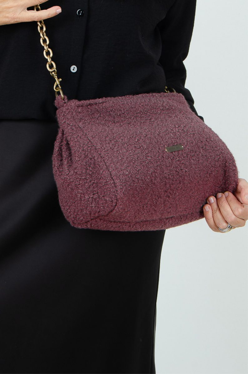 Bonito bolso confeccionado en tejido de tapicería efecto lana en color burdeos, lleva cierre de cremallera con tirador de piel negro.