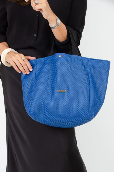 Bolsa tipo shopping bag con bastante capacidad confeccionada en bonito tejido de tapicería tipo neopreno en color azul klein.