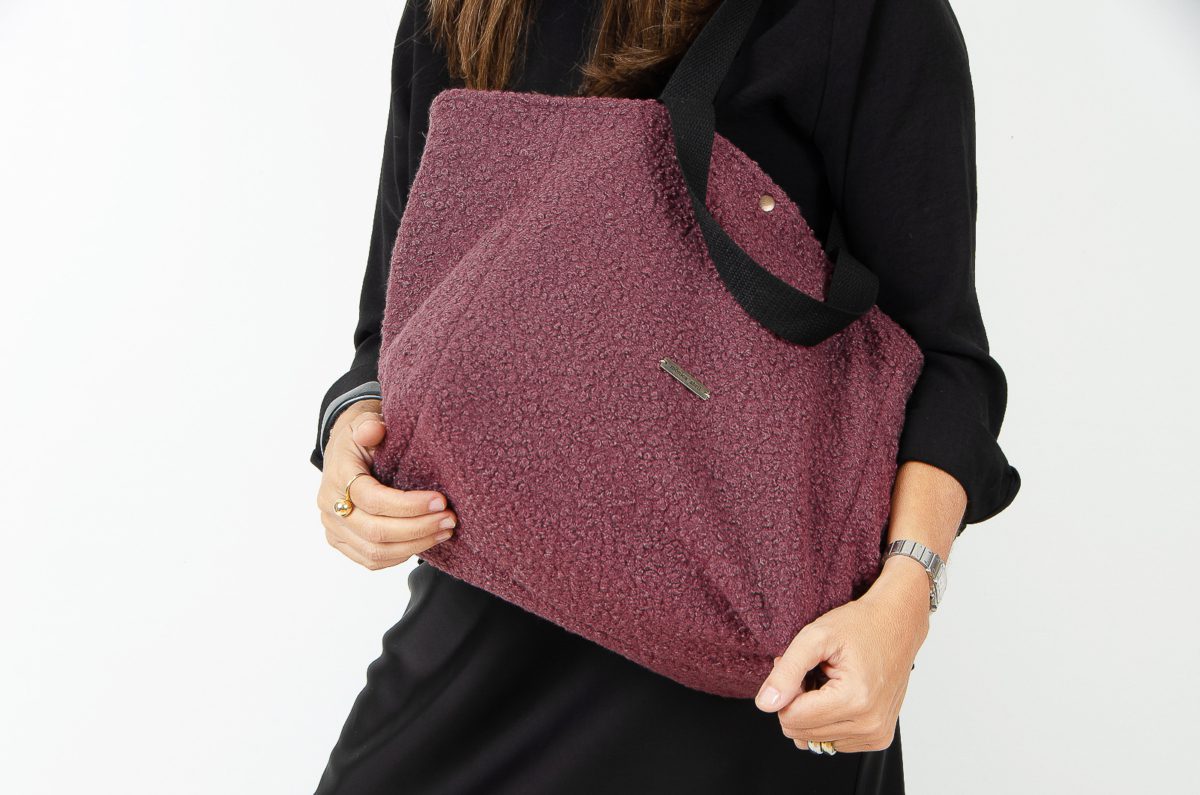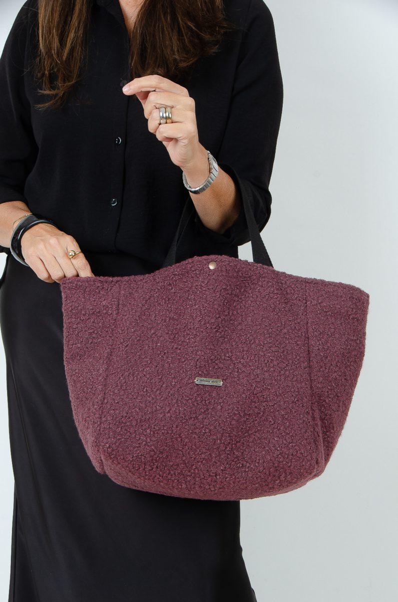 Bolsa tipo shopping bag con bastante capacidad confeccionada en bonito tejido de tapicería efecto lana en color burdeos.