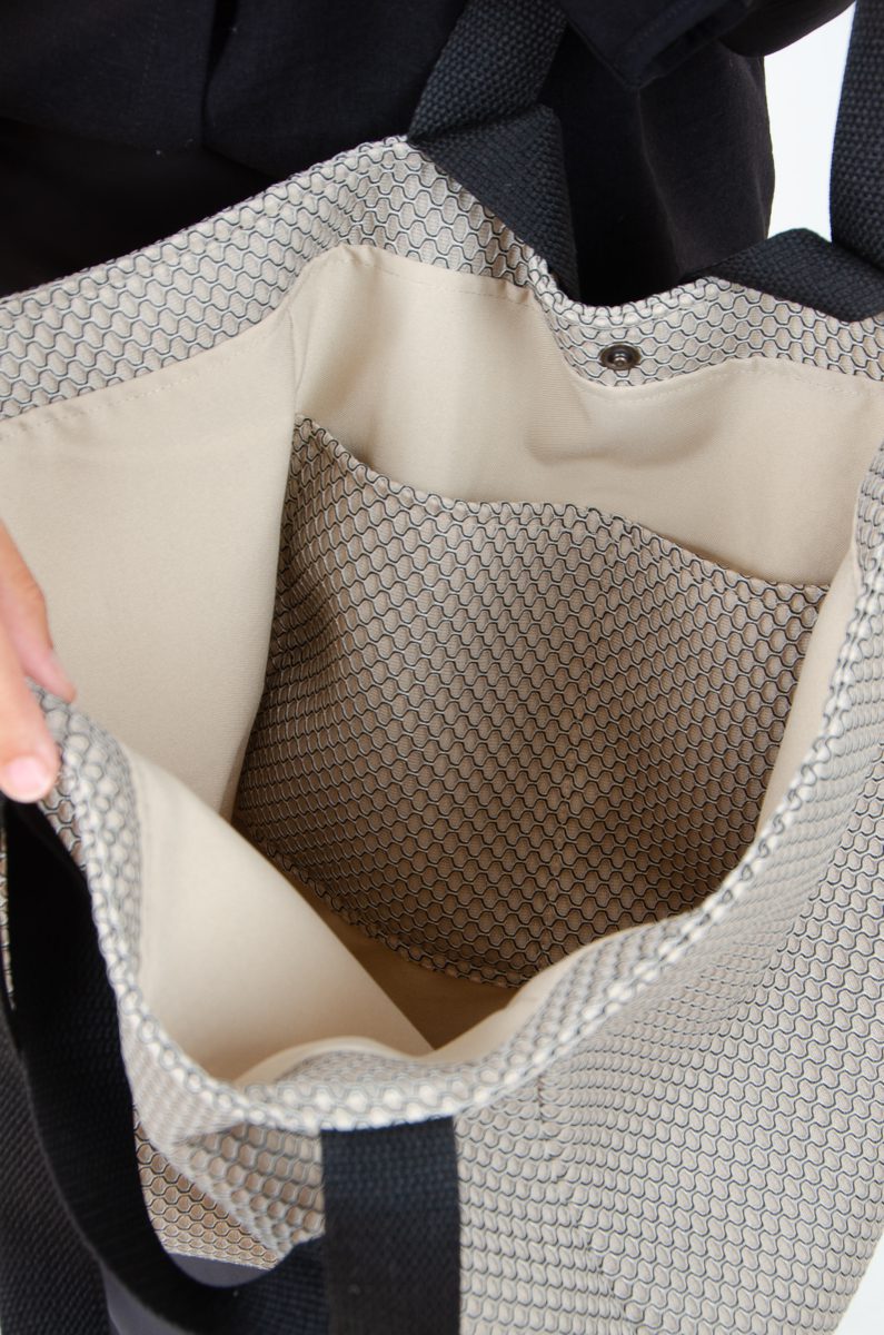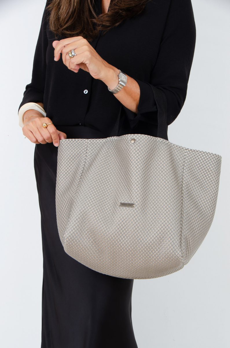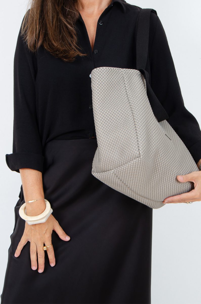 Bolsa tipo shopping bag con bastante capacidad confeccionada en bonito tejido de tapicería tipo neopreno en color piedra.