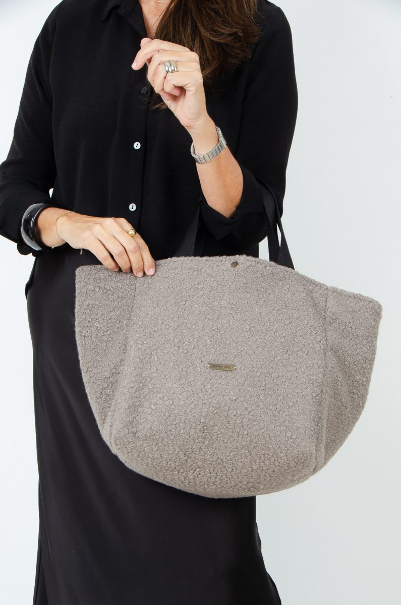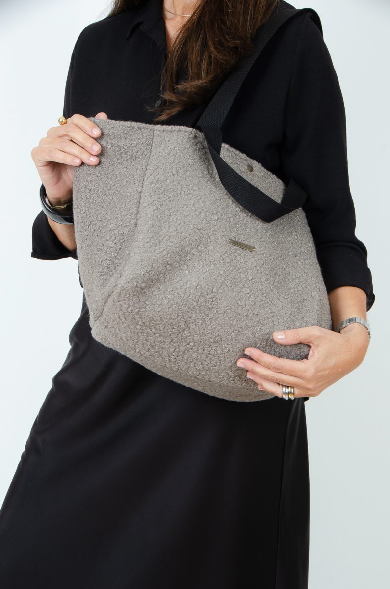 Bolsa tipo shopping bag con bastante capacidad confeccionada en bonito tejido de tapicería efecto lana en color taupe.
