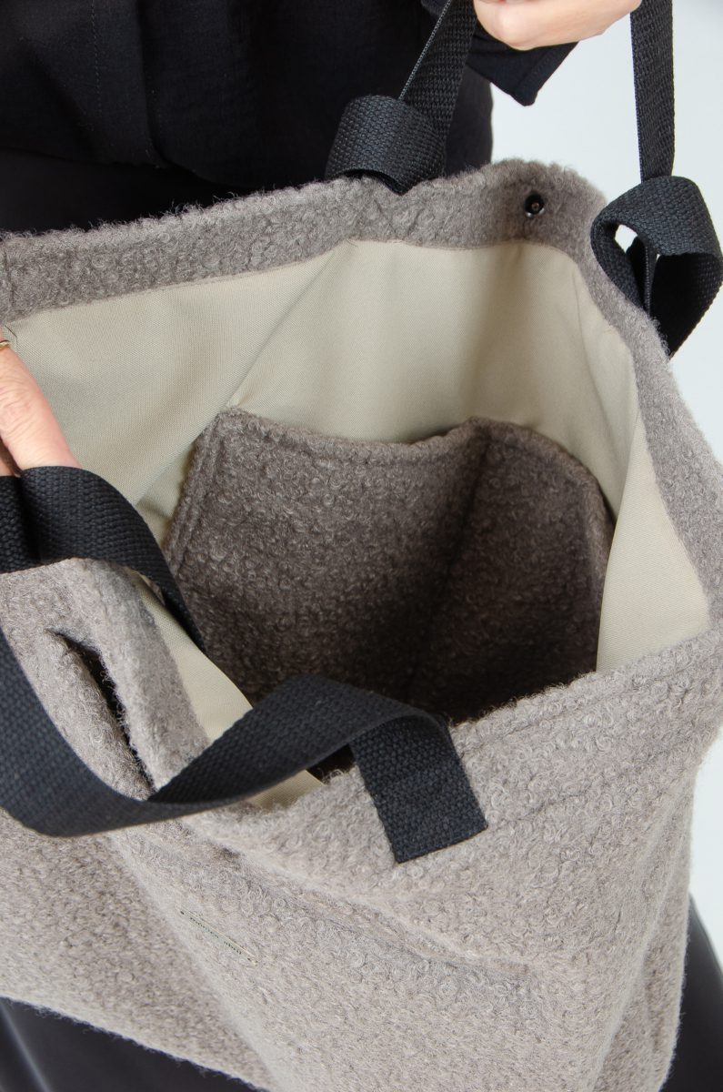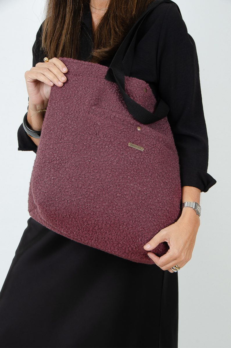 Bolsa tipo shopping bag de gran capacidad confeccionada en tejido de tapicería efecto lana en color burdeos.
