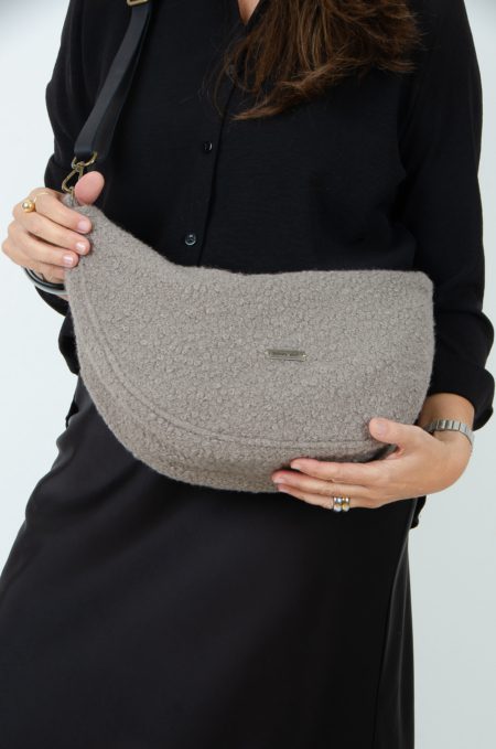 Bonito bolso confeccionado con tejido de tapicería efecto lana en color taupe, tiene bastante capacidad, va cerrado con cremallera y lleva bolsillo interior.