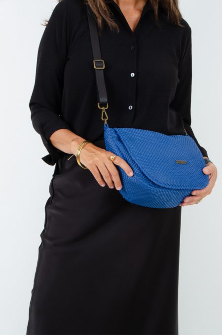 Bonito bolso con tapa confccionado con tejido de tapicería tipo neopreno en color azul klein, va cerrado con cremallera y lleva bolsillo interior y otro en el exterior.