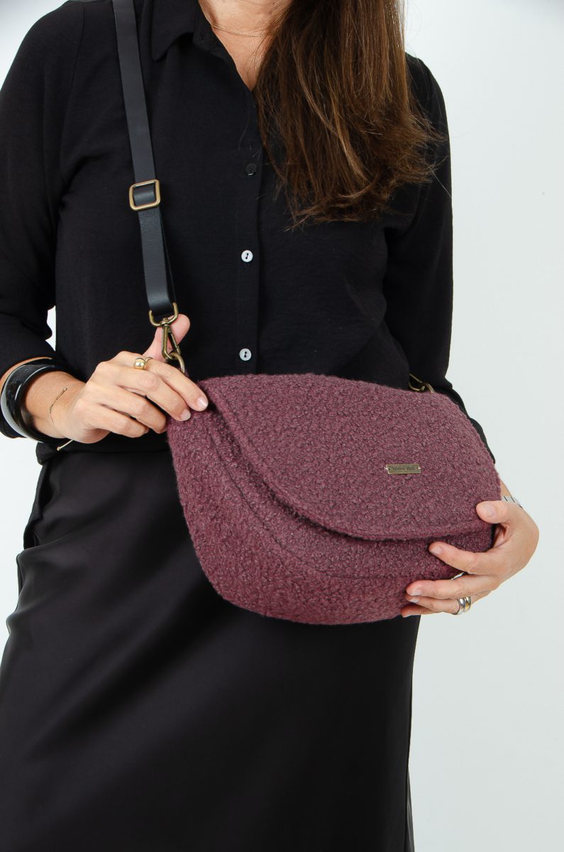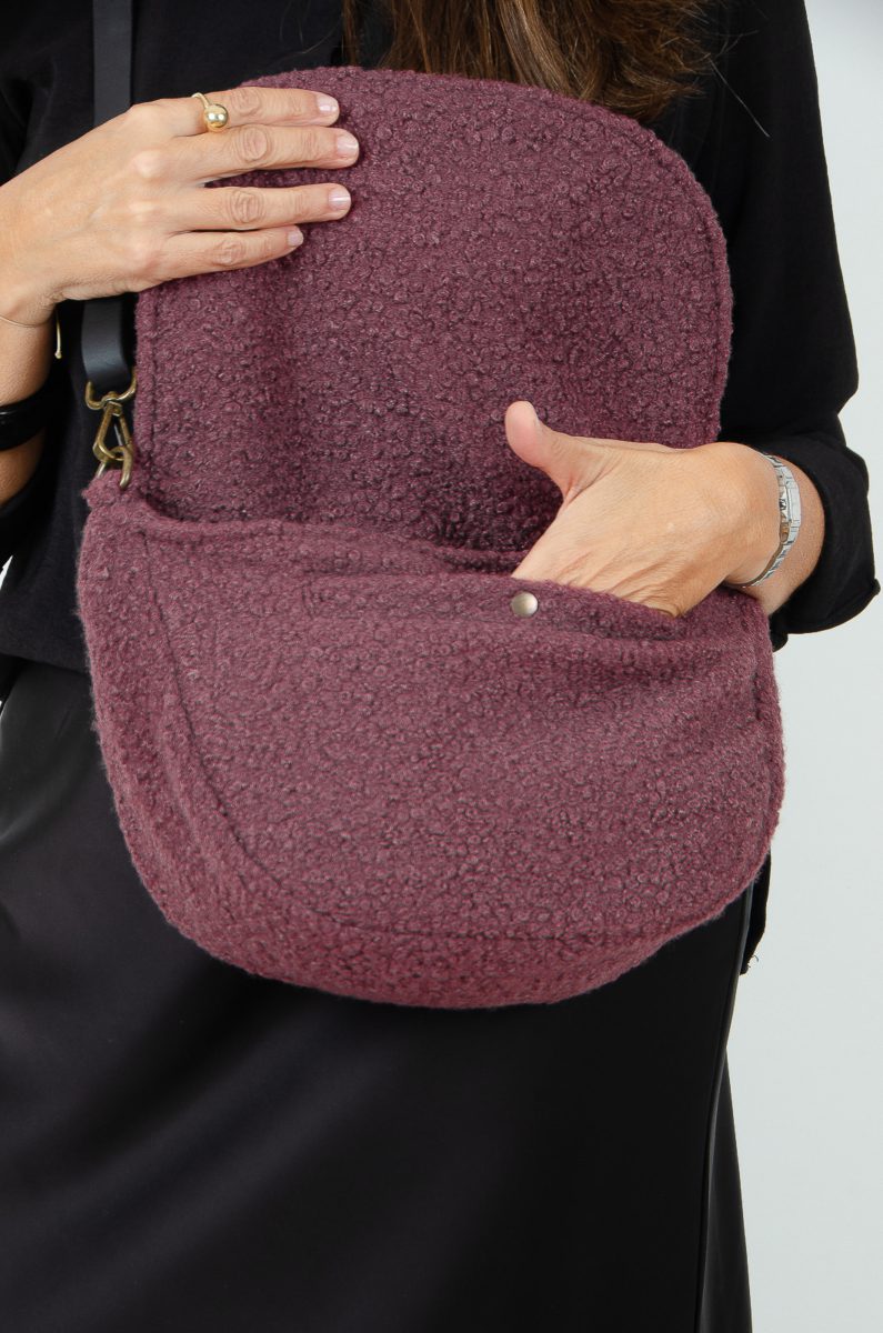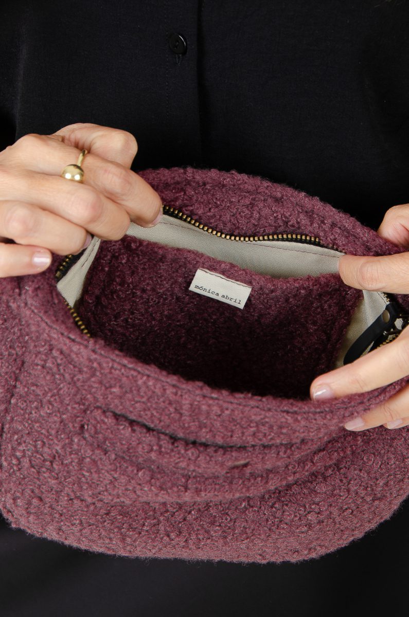 Bonito bolso con tapa confeccionado con tejido de tapicería efecto lana en color burdeos, va cerrado con cremallera y lleva bolsillo interior y otro en el exterior.
