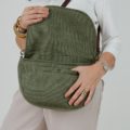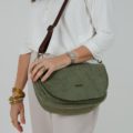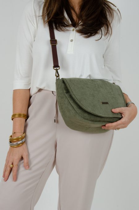 Bonito bolso con tapa confccionado con tejido de tapicería en color verde caqui, va cerrado con cremallera y lleva bolsillo interior y otro en el exterior.