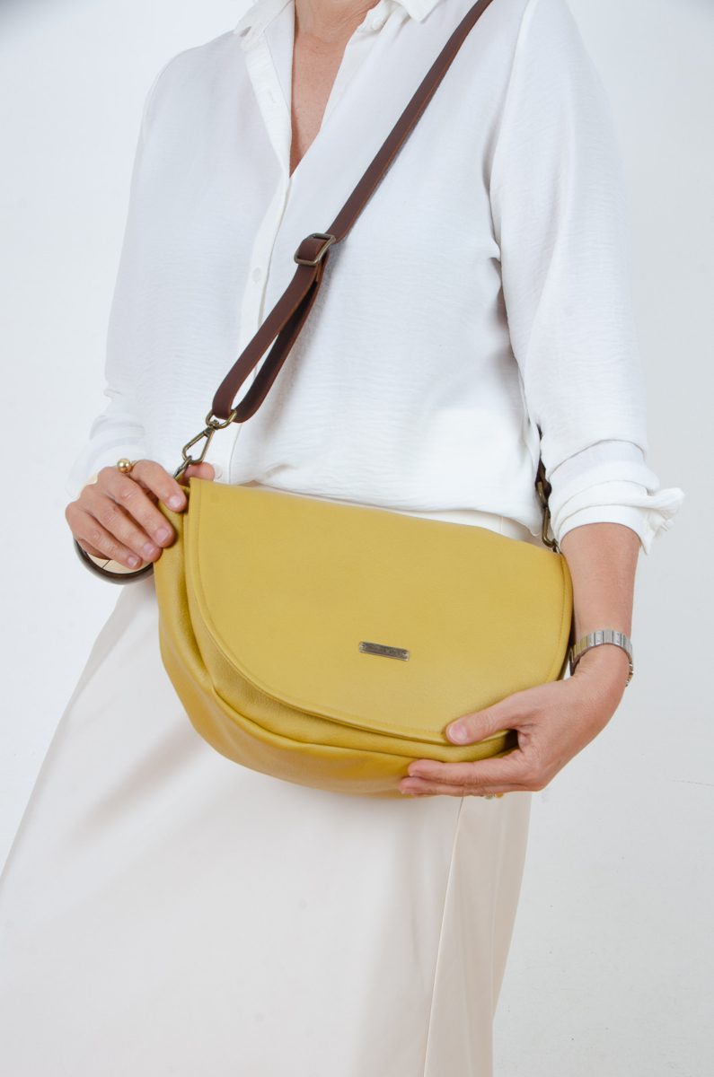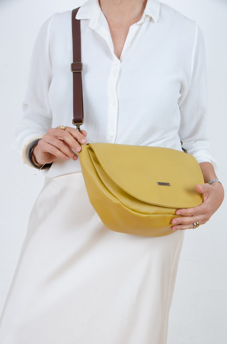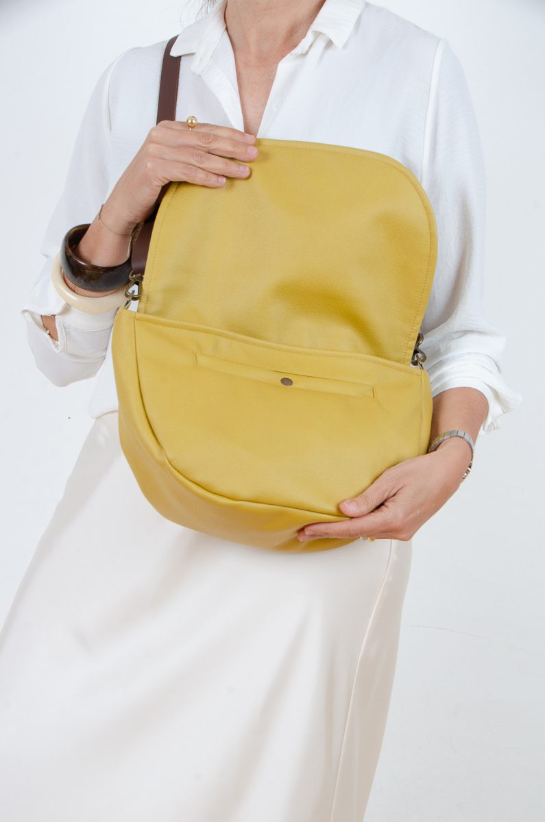 Bonito bolso con tapa confccionado con tejido de tapicería efecto piel en color lima, va cerrado con cremallera y lleva bolsillo interior y otro en el exterior.