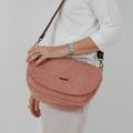 Bonito bolso con tapa confccionado con tejido de tapicería en color rosa nude, va cerrado con cremallera y lleva bolsillo interior y otro en el exterior.