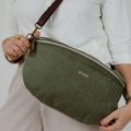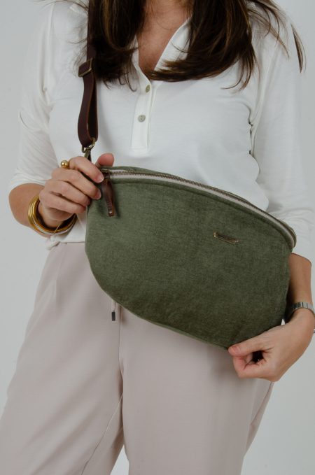 Bolso tipo riñonera de gran capacidad confeccionado con tejido de tapicería en color verde caqui, lleva cierre de cremallera y tirador en piel marrón.