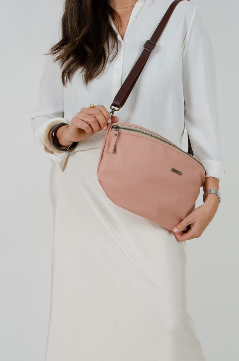 Bolso tipo riñonera de gran capacidad confeccionado con tejido de tapicería efecto piel en color rosa, lleva cierre de cremallera y tirador en piel marrón.