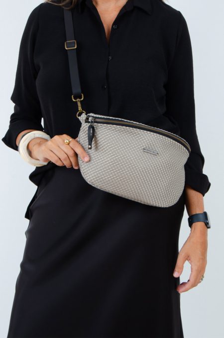 Bolso tipo riñonera confeccionado con tejido de tapicería tipo neopreno en color piedra, lleva cierre de cremallera y tirador en piel negro.