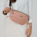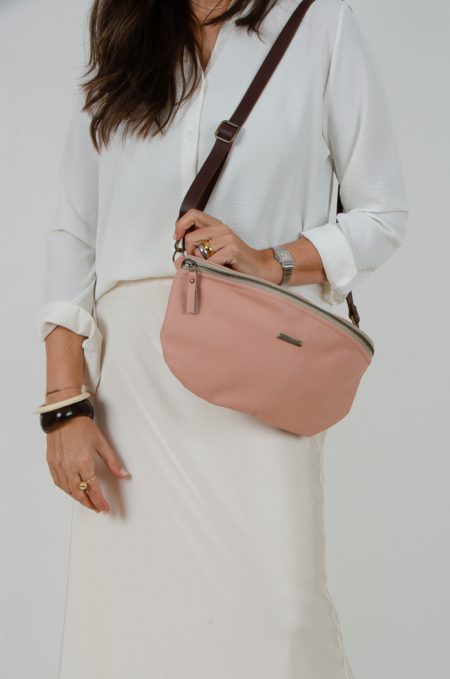 Bolso tipo riñonera confeccionado con tejido de tapicería efecto piel en color rosa, lleva cierre de cremallera y tirador en piel marrón.