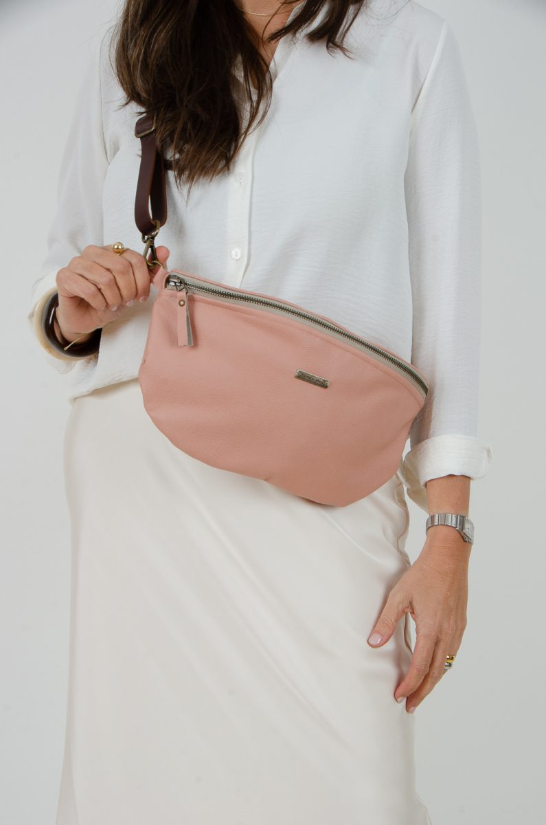 Bolso tipo riñonera confeccionado con tejido de tapicería efecto piel en color rosa, lleva cierre de cremallera y tirador en piel marrón.