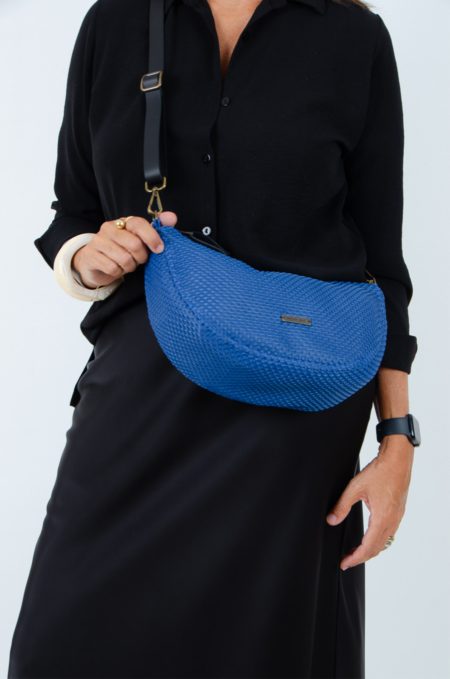 Bonito bolsito confeccionado en tejido de tapicería tipo neopreno en color azul klein, tiene bastante capacidad, va cerrado con cremallera y lleva bolsillo interior.