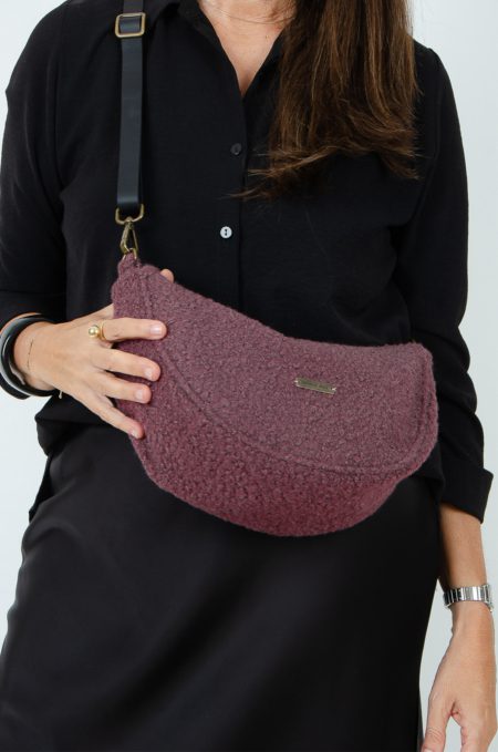 Bonito bolsito confeccionado en tejido de tapicería efecto lana en color burdeos, tiene bastante capacidad, va cerrado con cremallera y lleva bolsillo interior.