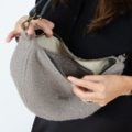 Bonito bolsito confeccionado en tejido de tapicería efecto lana en color taupe, tiene bastante capacidad, va cerrado con cremallera y lleva bolsillo interior.