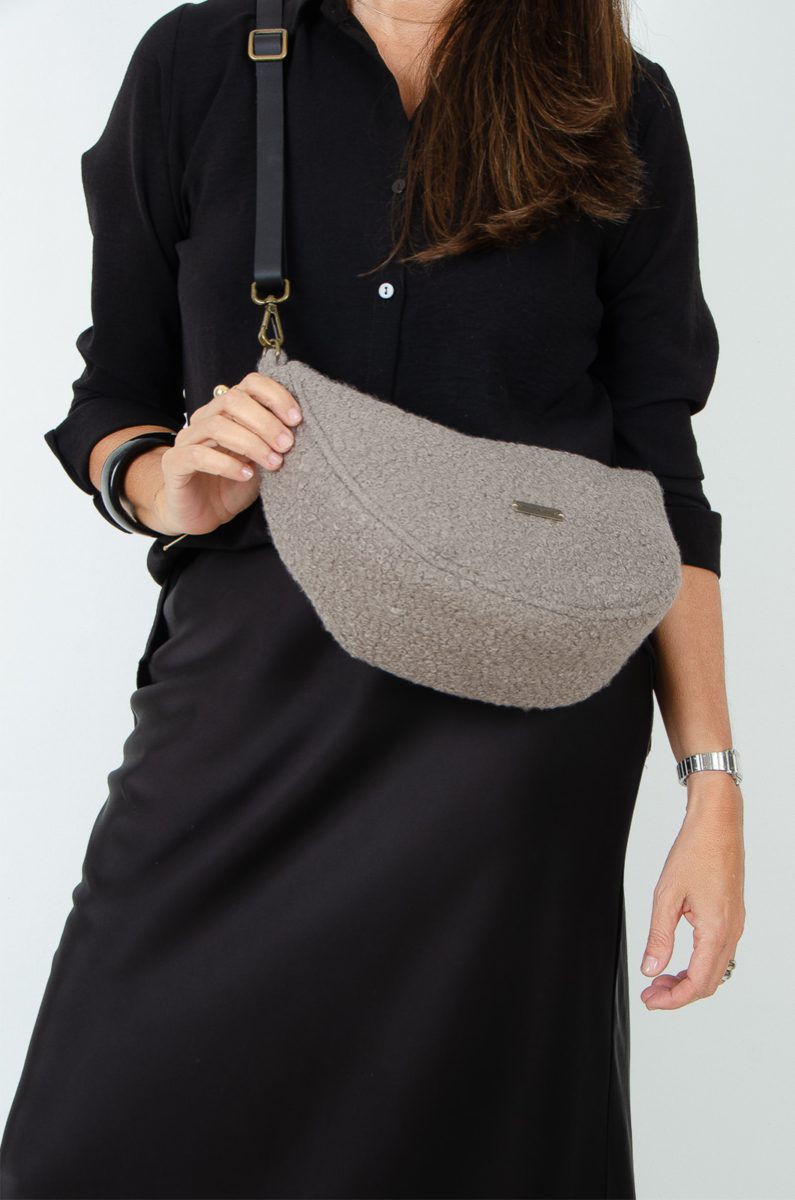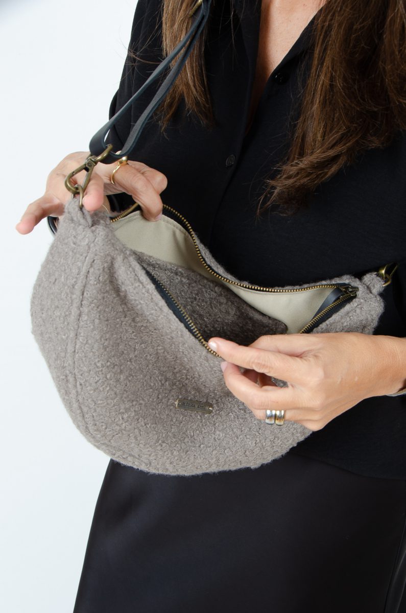 Bonito bolsito confeccionado en tejido de tapicería efecto lana en color taupe, tiene bastante capacidad, va cerrado con cremallera y lleva bolsillo interior.