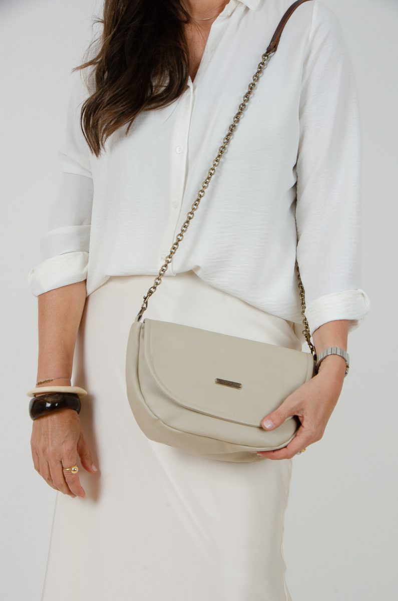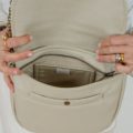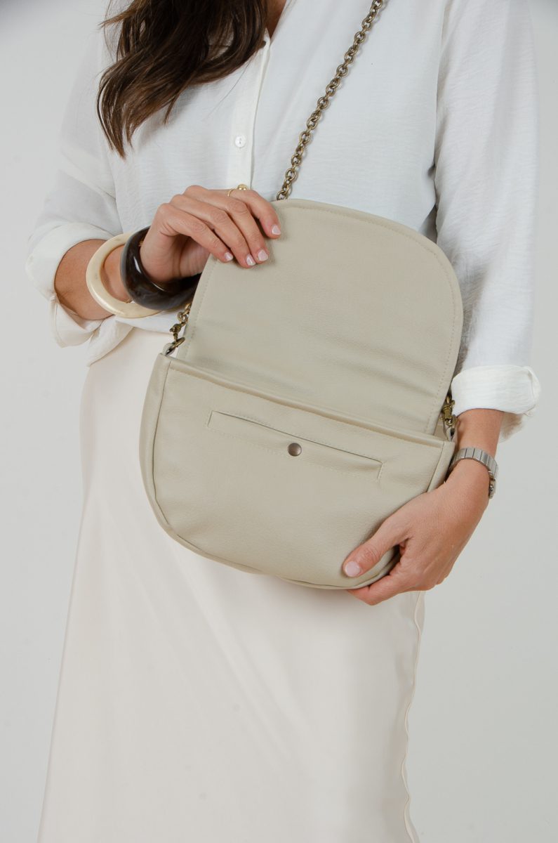 Bonito bolsito con tapa confeccionado en tejido de tapicería efecto piel en color arena, va cerrado con cremallera y lleva bolsillo interior y otro en el exterior.