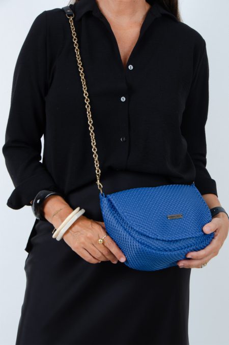 Bonito bolsito con tapa confeccionado en tejido de tapicería tipo neopreno de color azul klein, va cerrado con cremallera y lleva bolsillo interior y otro en el exterior.