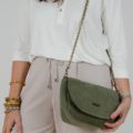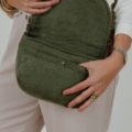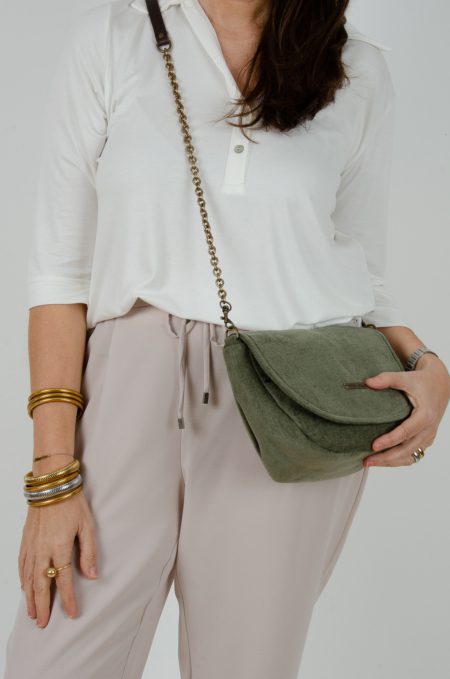 Bonito bolsito con tapa confeccionado en tejido de tapicería de color verde caqui, va cerrado con cremallera y lleva bolsillo interior y otro en el exterior.