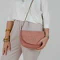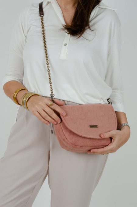 Bonito bolsito con tapa confeccionado en tejido de tapicería de color rosa nude, va cerrado con cremallera y lleva bolsillo interior y otro en el exterior.