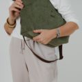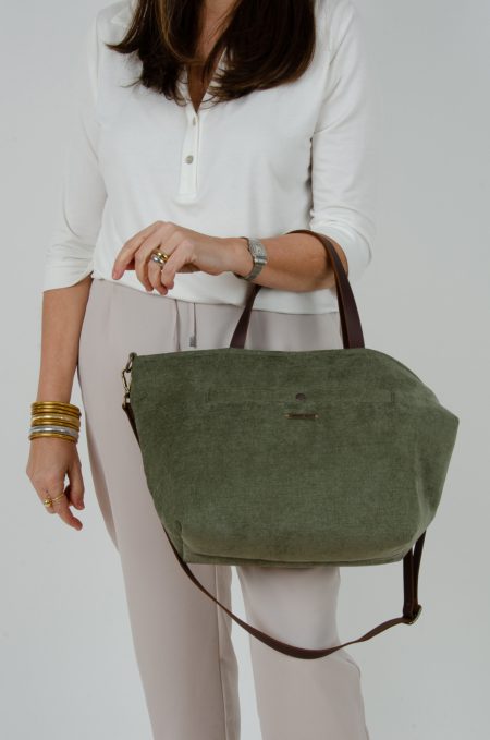 Bolso de tamaño mediano confeccionado con tejido de tapicería en color verde caqui.
