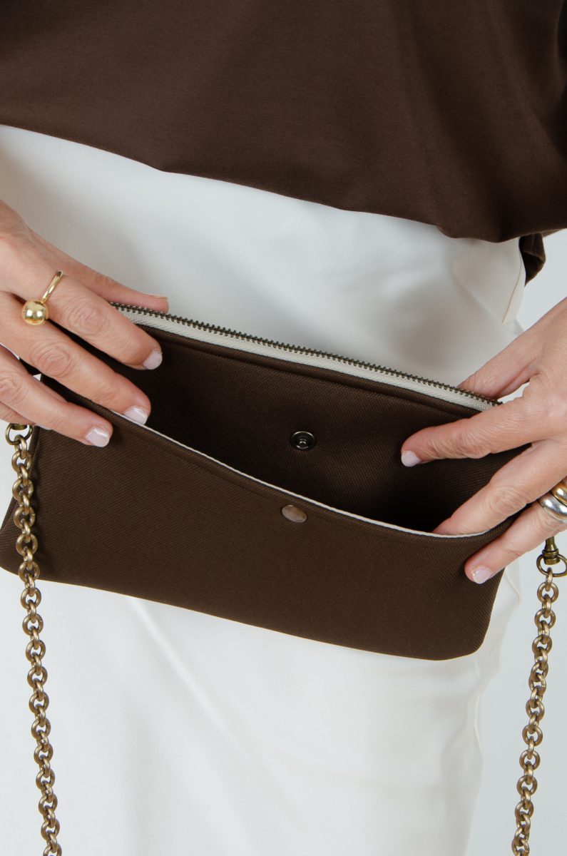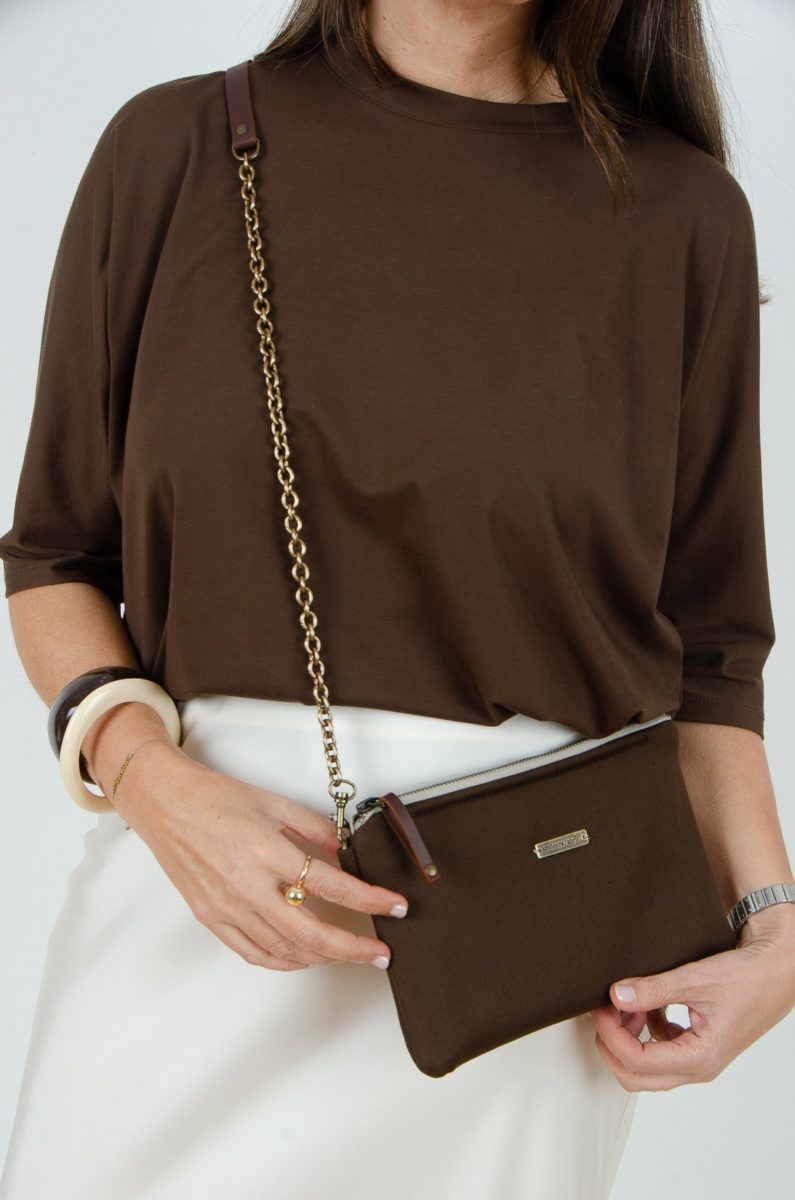 Bolso confeccionado en tejido de tapicería tipo neopreno en color marrón chocolate.
