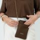 Lleva asa de cadena de aluminio en color oro viejo combinado con piel marrón, te puedes ajustar la largada de la cadena.