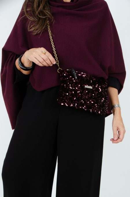 Bolso confeccionado en tejido terciopelo con lentejuelas en color burdeos.