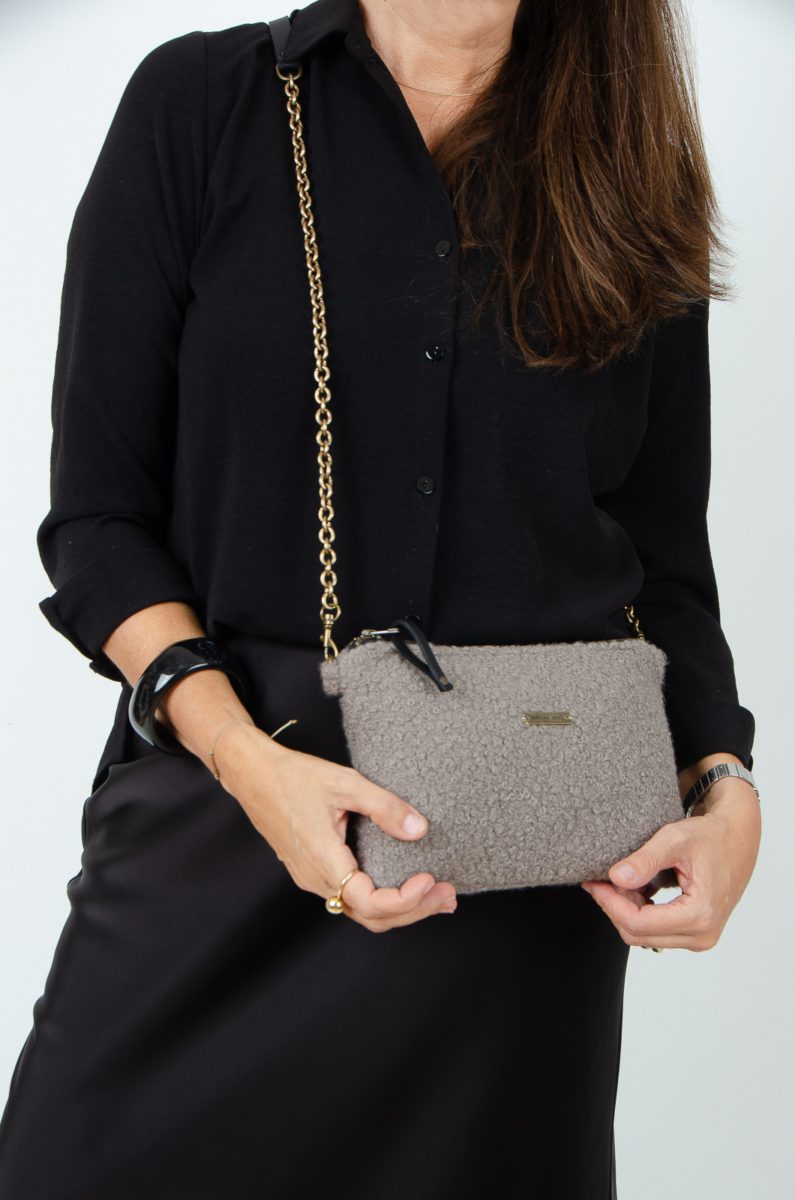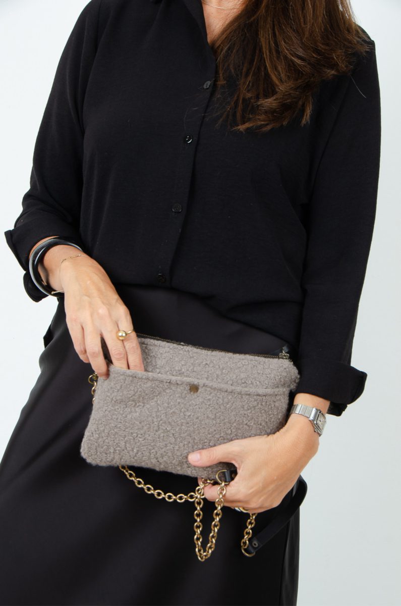 Bolso confeccionado en tejido de tapicería efecto lana en color taupe.