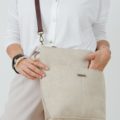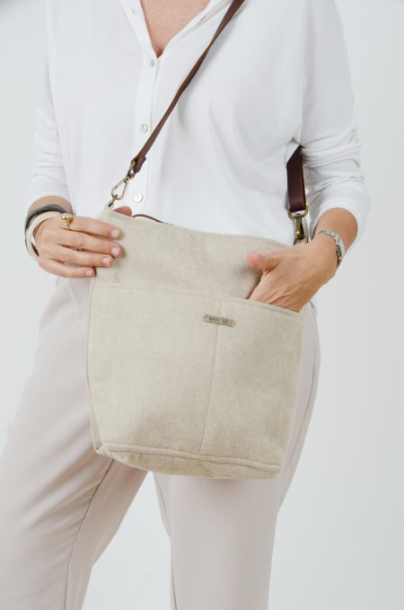 Lleva dos bolsillos de gran capacidad en el exterior y bolsillo en el interior, el bolso va forrado con tejido liso en color piedra.