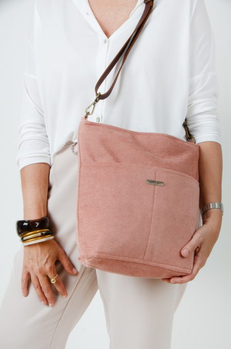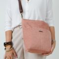 Cómodo bolso de tamaño mediano pero con bastante capacidad en tejido de tapicería en color rosa nude, va cerrado con cremallera.
