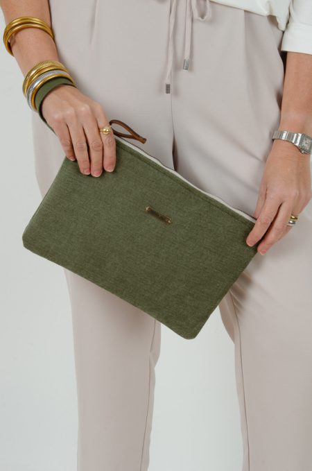 Clutch XL de gran capacidad ideal para organizar tu bolso o para llevarlo de bolsito de mano, confeccionado con tejido de tapicería en color verde caqui.