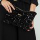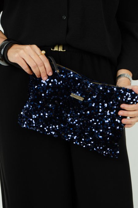 Clutch XL de gran capacidad ideal para organizar tu bolso o para llevarlo de bolsito de mano, confeccionado en terciopelo de lentejuelas en color azul noche.