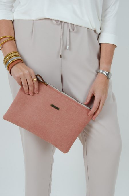 Clutch XL de gran capacidad ideal para organizar tu bolso o para llevarlo de bolsito de mano, confeccionado con tejido de tapicería en color rosa nude.