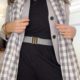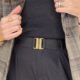 Cinturón elástico en color negro con estampado geométrico en tonos grises y crudo , lleva como cierre una bonita hebilla en color oro viejo.