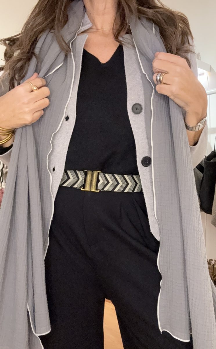 Cinturón elástico en color negro con estampado geométrico en tonos grises y crudo , lleva como cierre una bonita hebilla en color oro viejo.