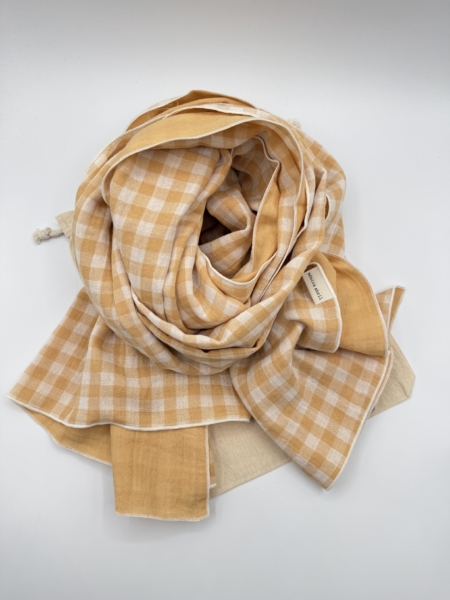 Foulard en suave bambula de algodón 100% combinado en cuadro vichy y liso en color amarillo suave con ribete crudo.