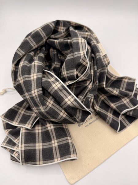 Foulard en suave tela 100% algodón orgánico de cuadros en color gris marengo, piedra y marrón con ribete crudo.